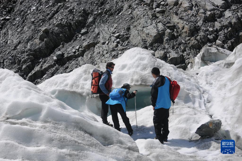 10月13日,人们在新西兰南岛西海岸福克斯冰川上徒步。