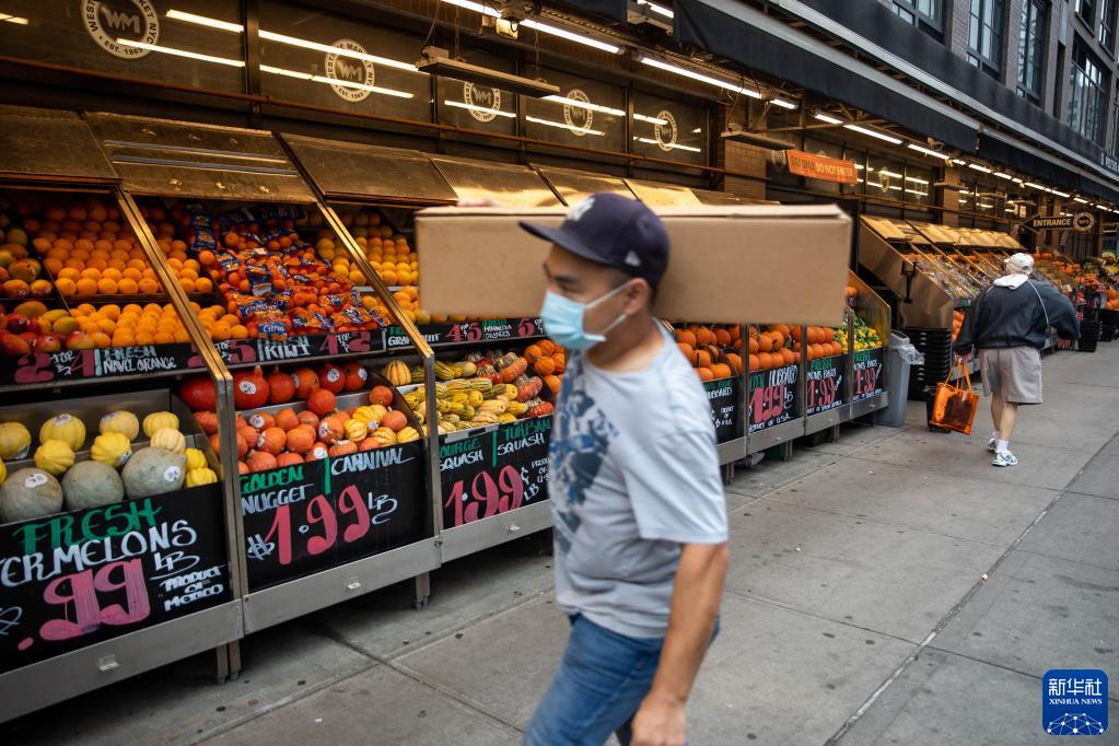 10月13日,行人从美国纽约一家超市的货架旁走过。新华社发