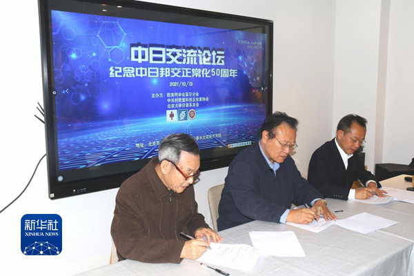 10月13日,欧美同学会留日分会会长曹卫洲(中)、中关村民营科技企业家协会会长黄显勇(右)、北京大学日语系友会会长李孙华出席“中日交流论坛”合作签字仪式。(新华社记者 蓝建中 摄)