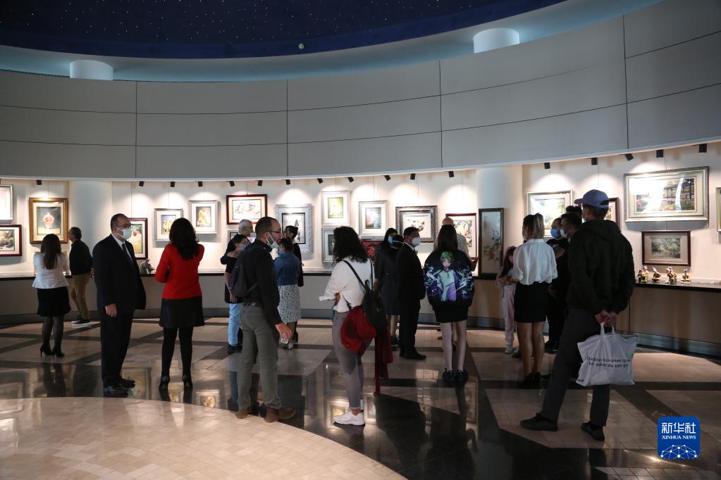 10月14日,人们在土耳其首都安卡拉那泽姆·希克梅特文化中心观看中国丝绸刺绣展。新华社记者 李振北 摄