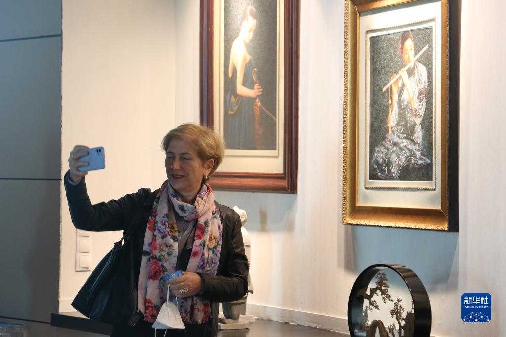 10月14日,观众在土耳其首都安卡拉那泽姆·希克梅特文化中心的中国丝绸刺绣展上自拍。新华社记者 李振北 摄