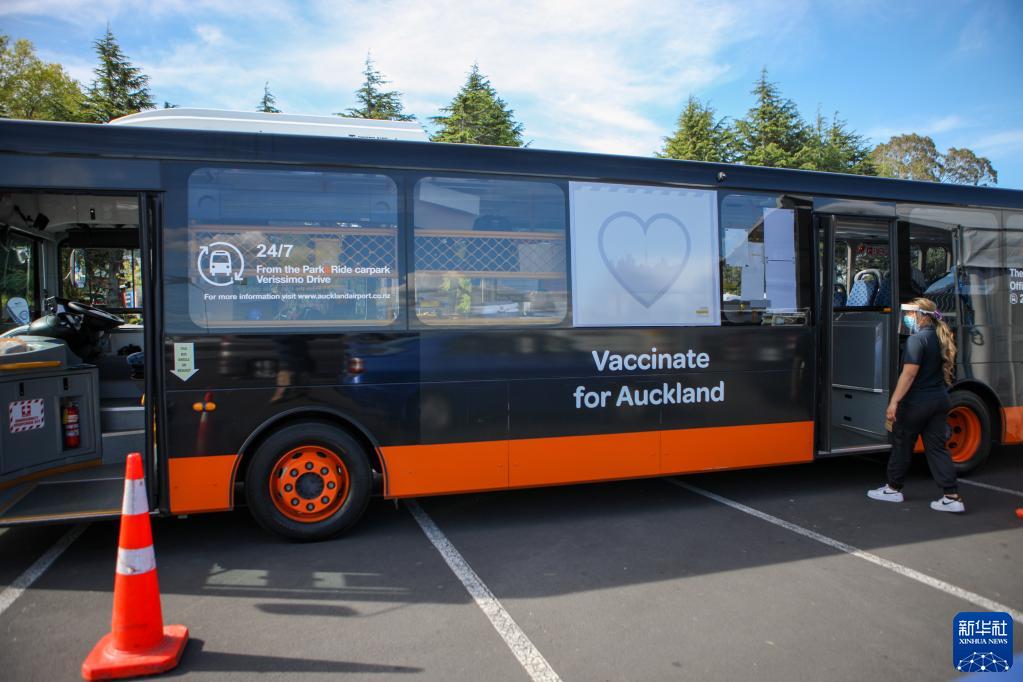 这是10月16日在新西兰奥克兰拍摄的一辆疫苗接种大巴车。