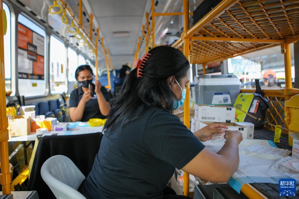 10月16日,在新西兰奥克兰,医务人员在巴士改造的疫苗接种点做准备工作。
