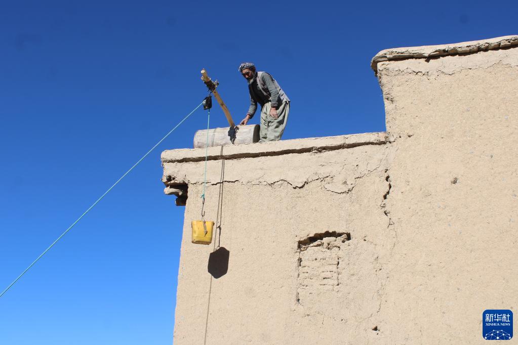 10月15日,在阿富汗瓦尔达克省,一名重返家园的男子修整受损的房屋。