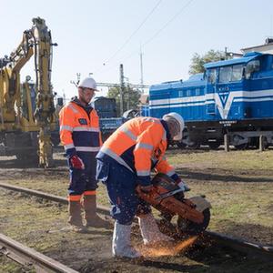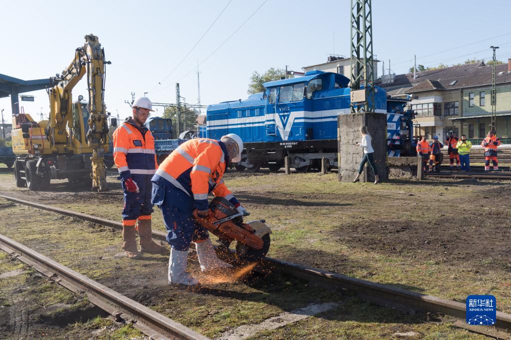 10月15日,在匈牙利基什孔豪洛什火车站,工人在匈塞铁路项目匈牙利段奠基仪式上拆除旧铁轨。