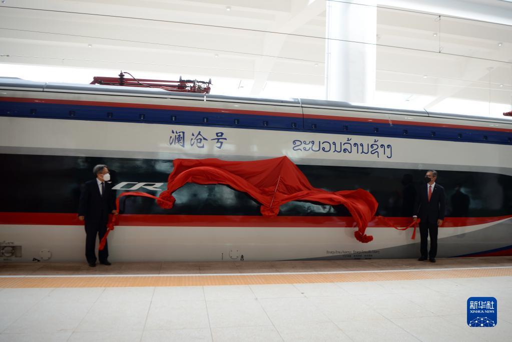 10月16日,中国驻老挝大使姜再冬(左)和老挝公共工程与运输部部长荣沙瓦在万象站为中老铁路“澜沧号”动车组揭牌。