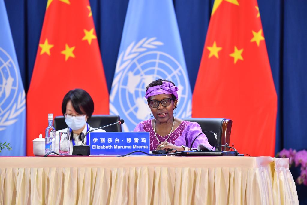 10月15日,2020年联合国生物多样性大会(第一阶段)在云南昆明闭幕。联合国《生物多样性公约》秘书处执行秘书伊丽莎白·穆雷玛在闭幕式上致辞。新华社记者李鑫摄