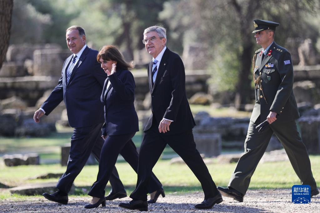 10月18日,希腊总统卡特里娜·萨克拉罗普卢(左二)、国际奥委会主席托马斯·巴赫(左三)、希腊奥委会主席斯皮罗斯·卡普拉洛斯(左一)抵达古奥林匹亚遗址出席北京冬奥会火种采集仪式。