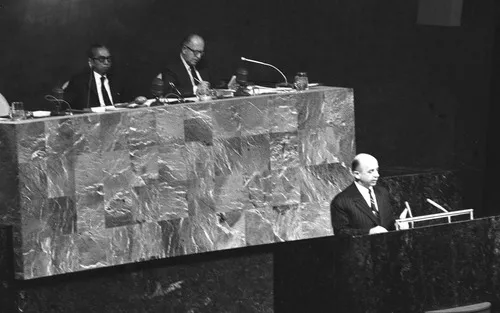 1971年11月15日,阿尔巴尼亚驻联合国常任代表萨米·巴霍利在第26届联大全体会议上发言,欢迎中国代表团。新华社记者 钱嗣杰 摄