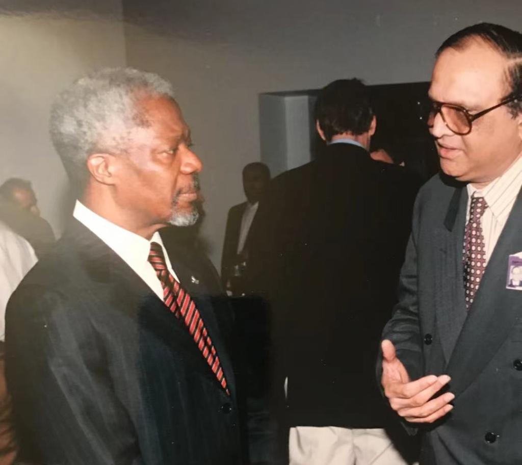 巴基斯坦联合通讯社常驻联合国记者伊夫蒂哈尔·阿里(右)早期照片。图中左侧人物为联合国前秘书长科菲·安南。(受访者供图)