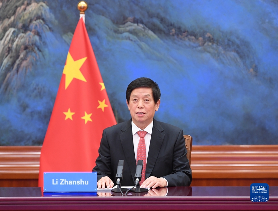 10月21日,全国人大常委会委员长栗战书在北京人民大会堂以视频方式同乌干达议长奥兰亚举行会谈。新华社记者 申宏 摄