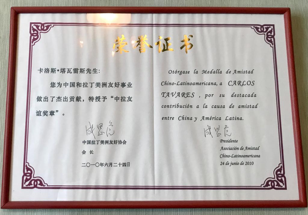为表彰塔瓦雷斯为发展中巴友谊所作贡献,2010年他获得中国拉丁美洲友好协会授予的“中拉友谊奖章”。
