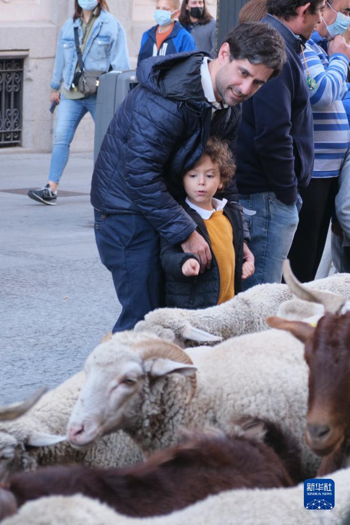 10月24日,人们观看走过西班牙马德里市中心的羊群。
