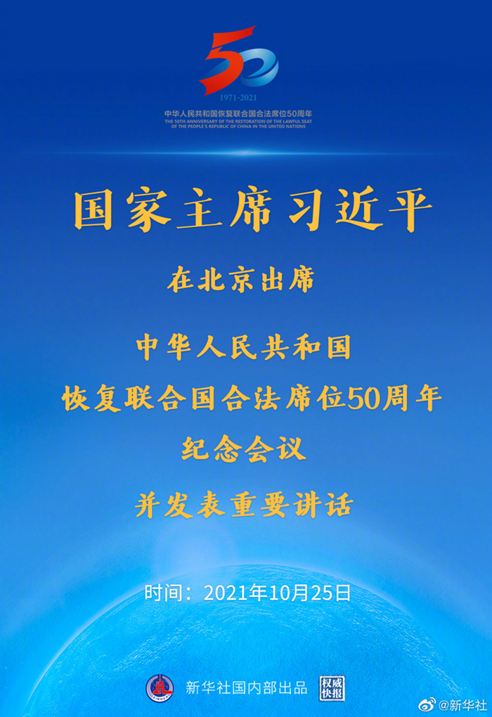 习近平强调,50年前的今天,第二十六届联合国大会以压倒性多数通过第2758号决议,决定恢复中华人民共和国在联合国的一切权利,承认中华人民共和国政府代表是中国在联合国的唯一合法代表。这是中国人民的胜利,也是世界各国人民的胜利!2021-10-25