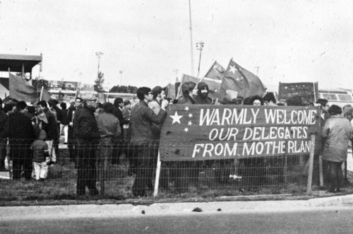 1971年11月11日,来自美国各地的爱国华侨,手持中华人民共和国国旗和“热烈欢迎祖国代表团”的标语,聚集到纽约肯尼迪国际机场欢迎中国代表团。新华社发