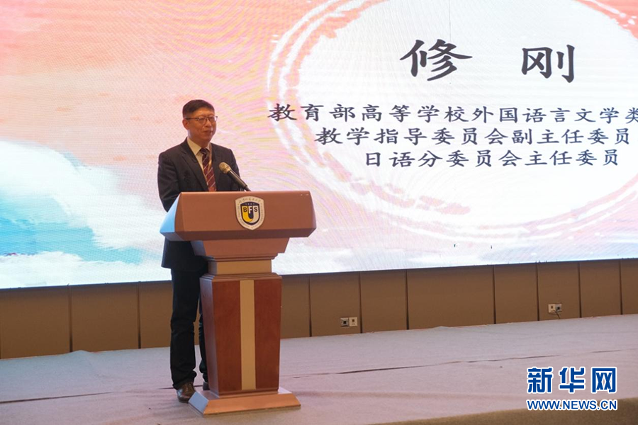 10月23日,教育部高等学校外国语言文学类专业教学指导委员会副主任委员、日语分委员会主任委员修刚致辞。新华网 陈雨宁 摄