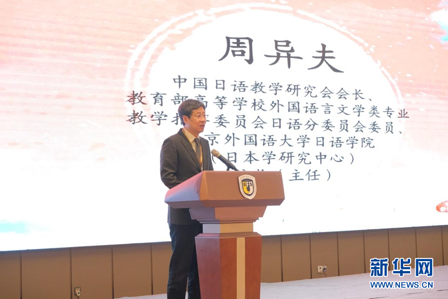 10月23日,中国日语教学研究会会长、教育部高等学校外国语言文学类专业教学指导委员会日语分委员会委员周异夫现场致辞。新华网 陈雨宁 摄