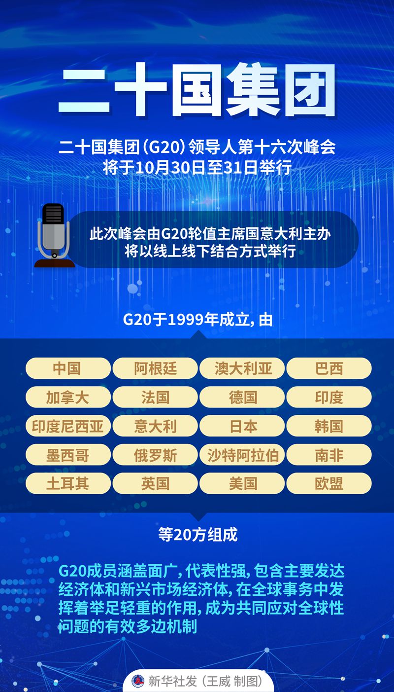 二十国集团(G20)领导人第十六次峰会将于10月30日至31日举行。此次峰会由G20轮值主席国意大利主办,将以线上线下结合方式举行。