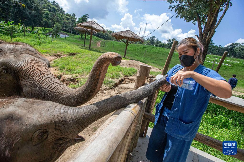 10月27日,工作人员在泰国南邦府的大象保护中心给大象喂水。