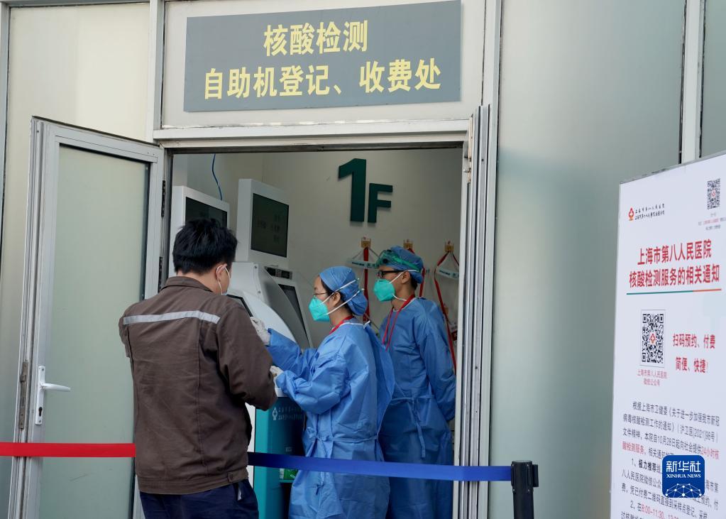 10月30日,在上海市第八人民医院,志愿者帮助市民进行核酸检测的登记和缴费。从10月28日起,该院开始提供24小时核酸检测服务。