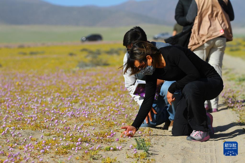10月13日,在智利北部的阿塔卡马沙漠,游人欣赏沙漠中开花的美景。
