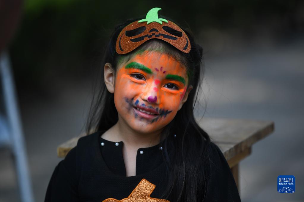 10月31日,在墨西哥首都墨西哥城,一名儿童参加亡灵节游行。新华社记者 辛悦卫 摄