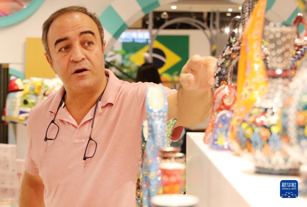 来自土耳其的拉玛赞在位于上海绿地贸易港的商铺内向顾客介绍土耳其特色商品(9月7日摄)。