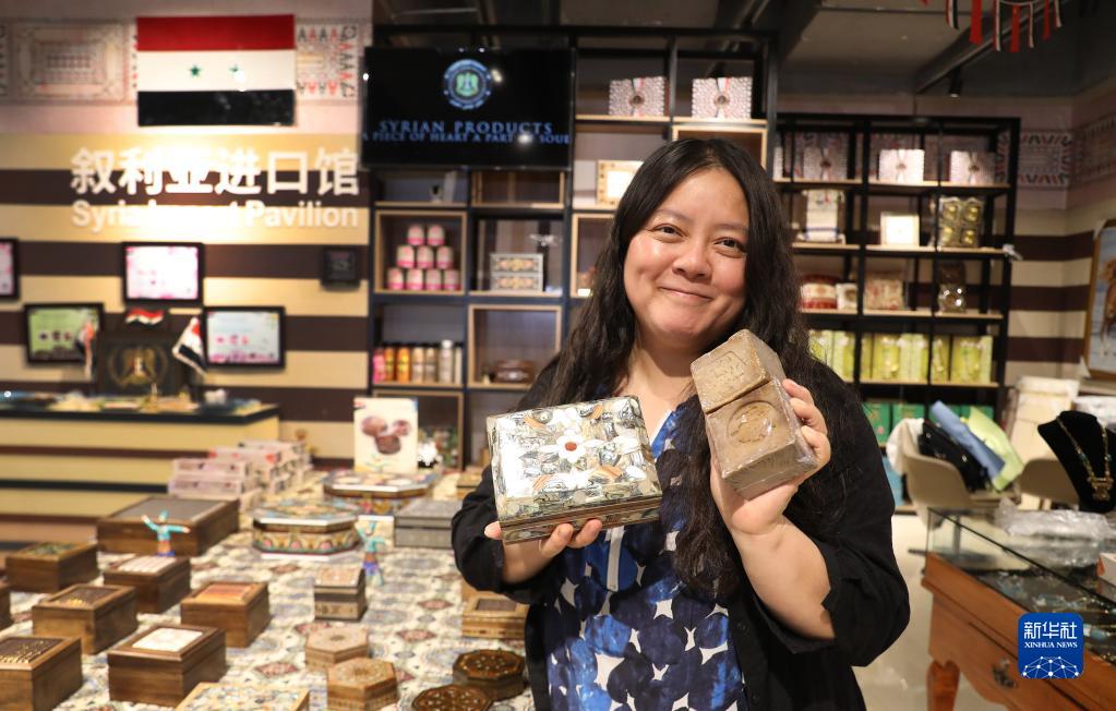 董晶岩在位于上海绿地贸易港的商铺内展示叙利亚特色商品(10月21日摄)。奔走于中国和叙利亚间的中国姑娘董晶岩,带领众多叙利亚小企业“抱团”参加进博会,她的叙利亚“朋友圈”也越来越广。