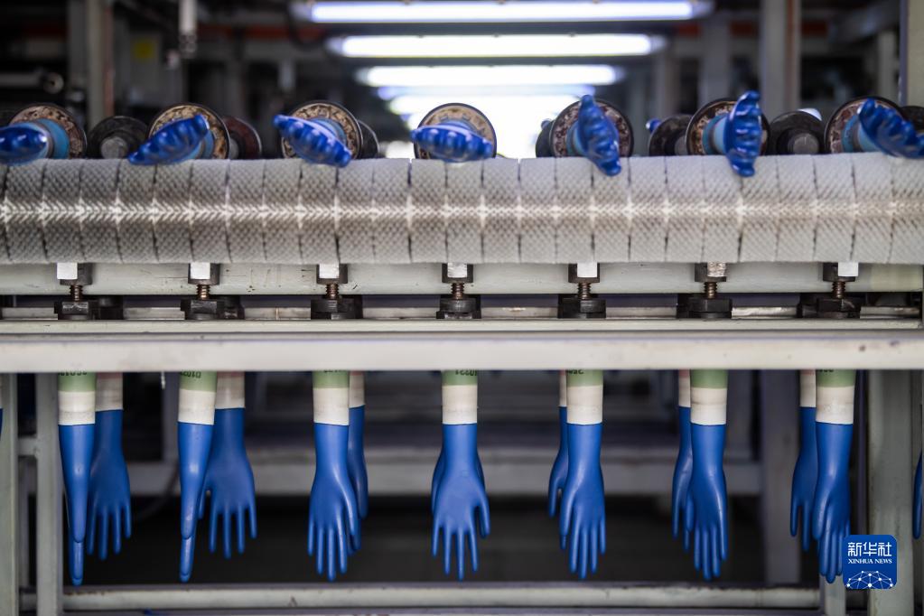 这是10月20日在位于马来西亚雪兰莪州巴生的马来西亚橡胶手套制造商高产柅品工业工厂里拍摄的生产线。