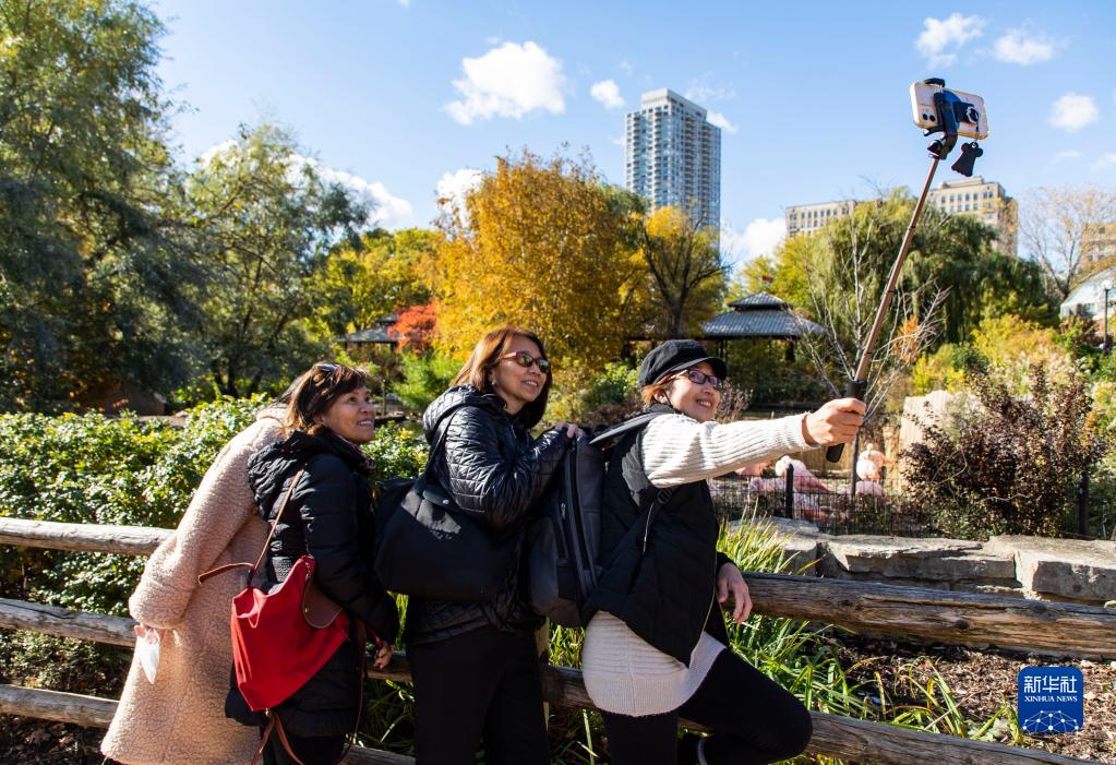 11月2日,游人在美国芝加哥林肯公园动物园自拍。