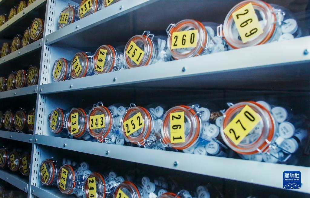 这张10月18日翻拍的照片显示的是,在英国南部韦克赫斯特基尤千年种子库内,玻璃瓶中的种子保存在零下20摄氏度的地下室中。