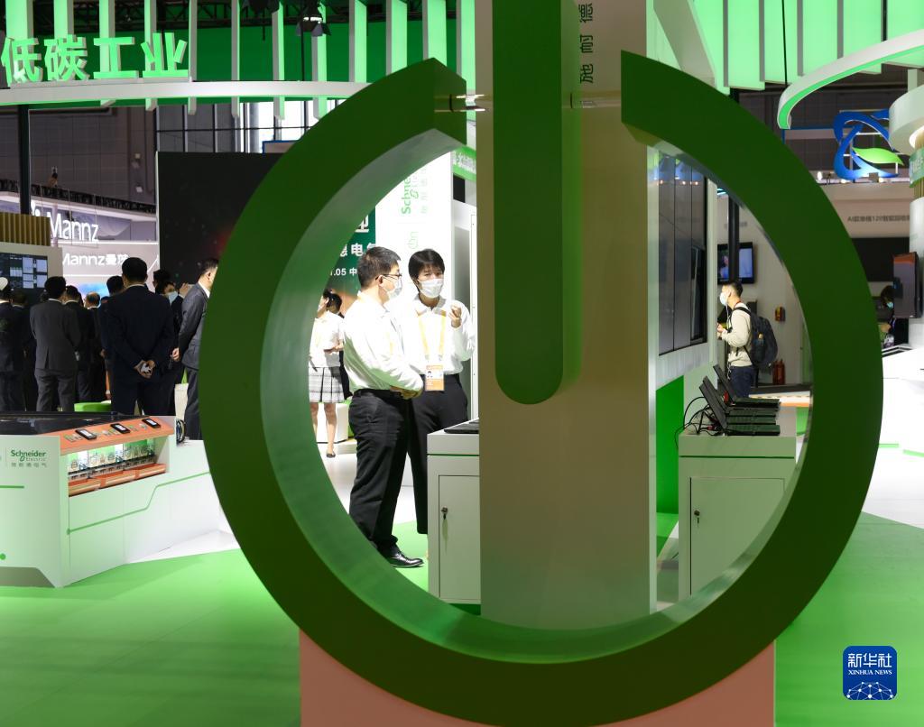 11月5日,展商代表在第四届进博会技术装备展区施耐德电气展台沟通交流。