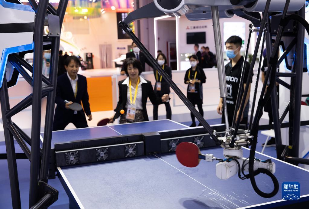 11月5日,参观者在第四届进博会技术装备展区和“乒乓球教练机器人”打球。