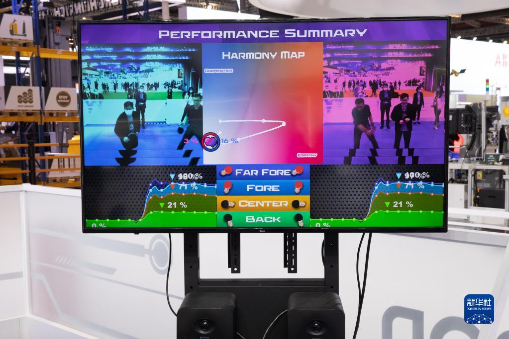 11月5日,“乒乓球教练机器人”在第四届进博会技术装备展区分析“对手”技术数据。