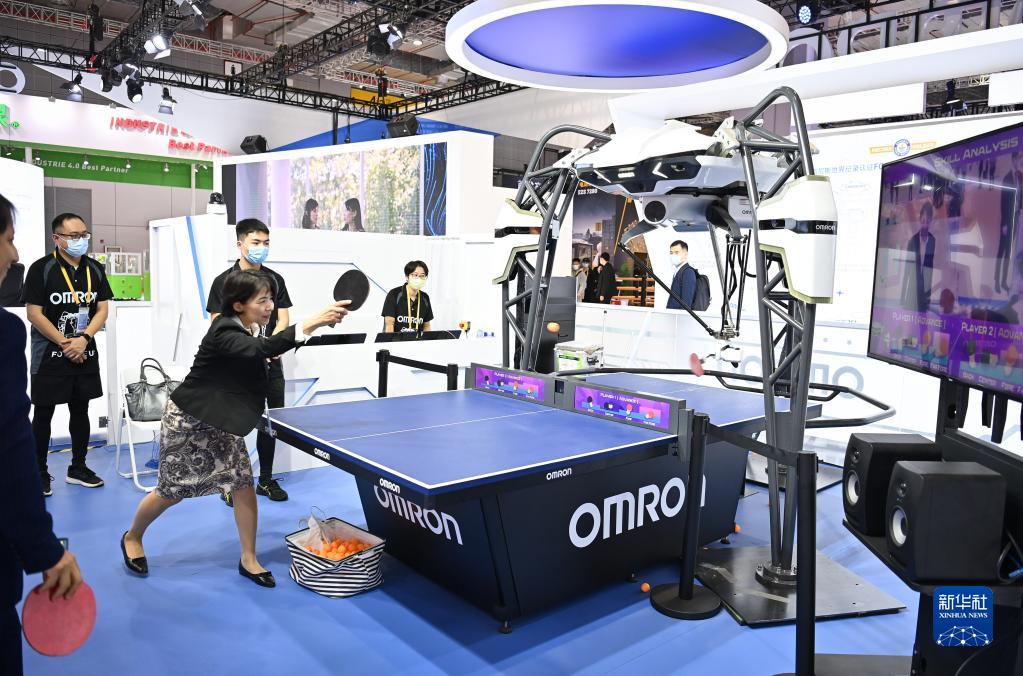 11月5日,参观者在第四届进博会技术装备展区和“乒乓球教练机器人”打球。