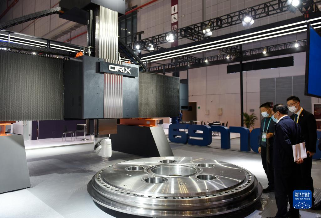 11月5日,参观者在第四届进博会技术装备展区尼古拉斯克雷亚展台了解高架桥式龙门加工中心和由其加工的风力发电设备零部件。