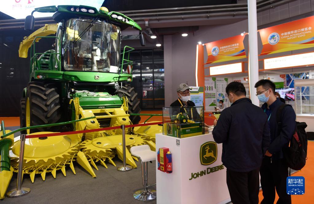 11月5日,参观者在第四届进博会技术装备展区约翰迪尔展台了解青贮机。
