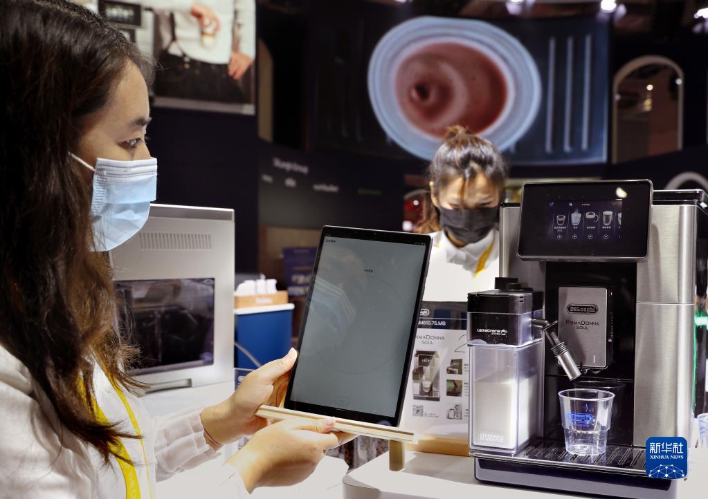 11月5日,德龙公司的展台人员展示可以连接App操作、可根据所选用咖啡豆特性自动进行适配操作的智能咖啡机。