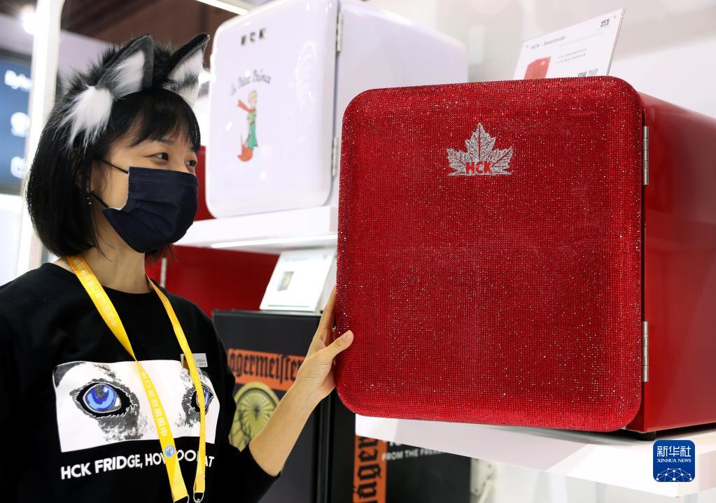 11月5日,芬兰某家电品牌的展台人员在介绍为女性消费者打造的水晶贴面的化妆品冰箱。