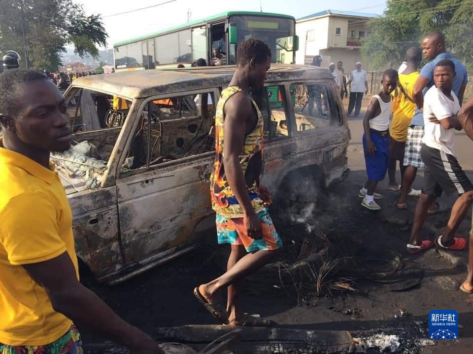 11月6日,民众在塞拉利昂弗里敦市的爆炸现场经过被烧毁的车辆(手机拍摄)。