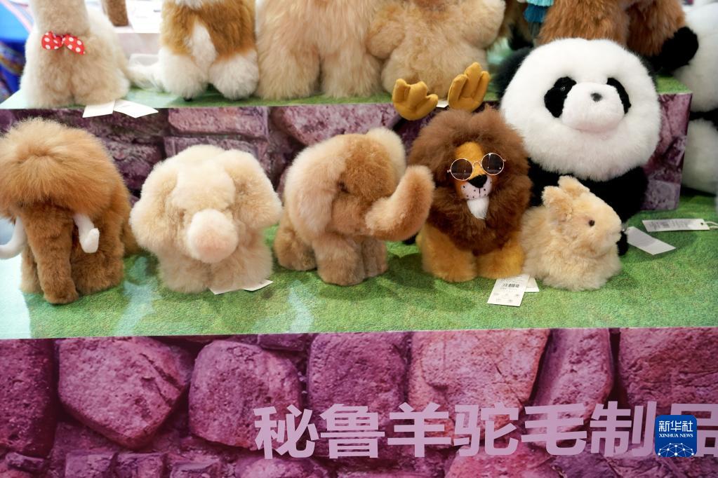 在进博会马玉霞的展位拍摄的秘鲁羊驼毛制作的动物玩偶(11月6日摄)。