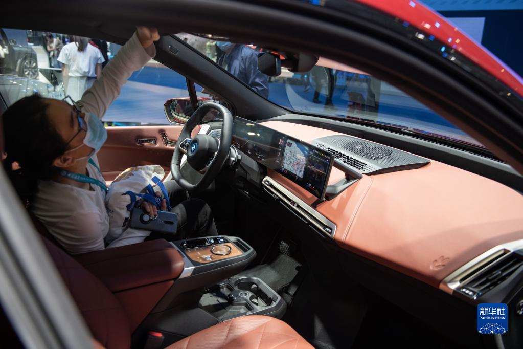 11月7日,参观者在第四届进博会汽车展区宝马展台体验新能源汽车。