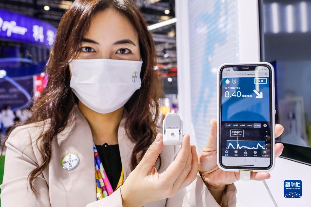 11月7日,在医疗器械及医药保健展区的拜耳展台,工作人员展示在中国首展首秀的拜耳持续葡萄糖监测系统。