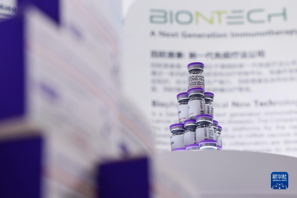 11月7日在医疗器械及医药保健展区复星健康展台拍摄的新冠病毒mRNA疫苗包装,该疫苗由复星医药与德国百欧恩泰合作开发。