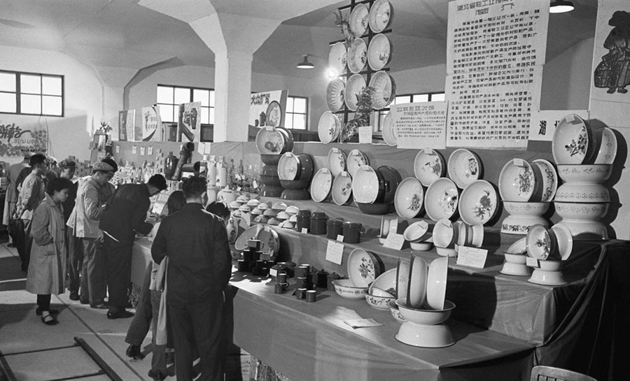 1965年,面向农村轻工业产品展览会在上海举行。展览会展出了玻璃陶瓷、日用机械、文化用品、日用化学、食品等15个行业的1万多件产品。新华社记者 夏道陵 摄
