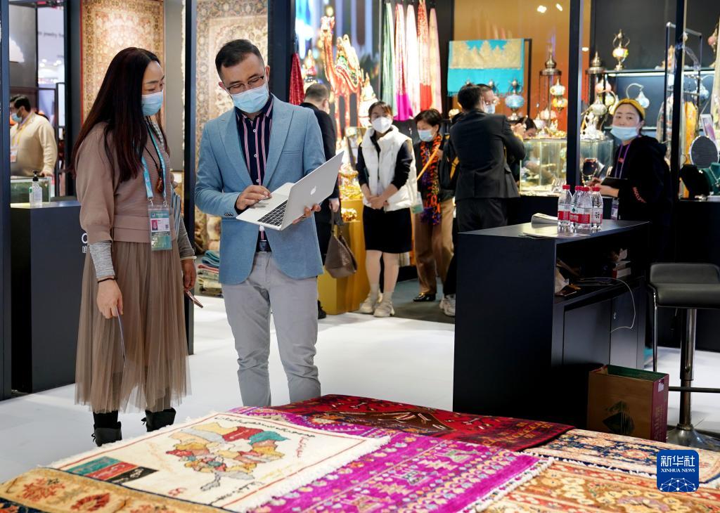 11月8日,工作人员在进博会阿富汗手工羊毛地毯展台与参观者交流。
