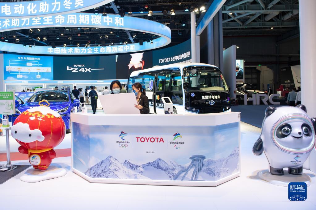 11月7日在第四届进博会汽车展区丰田展台拍摄的的“冰墩墩”和“雪容融”。