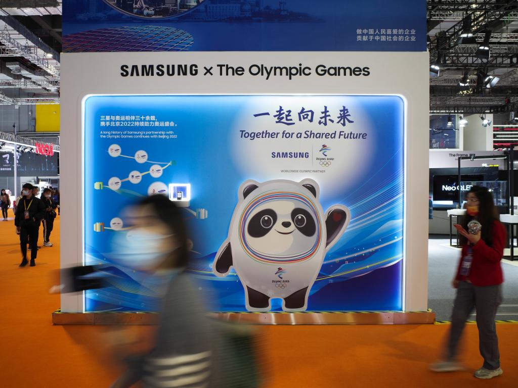 11月5日在第四届进博会技术装备展区拍摄的三星展台“冰墩墩”展板。