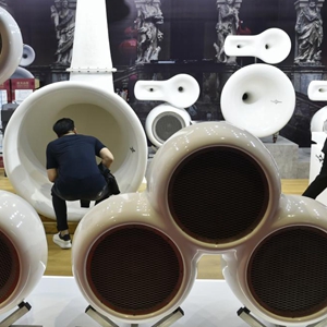 11月6日,参会者在第四届进博会展馆里的意大利PEQUOD公司展位参观音响设备。PEQUOD公司首次参展进博会。(新华社记者鲁鹏摄)