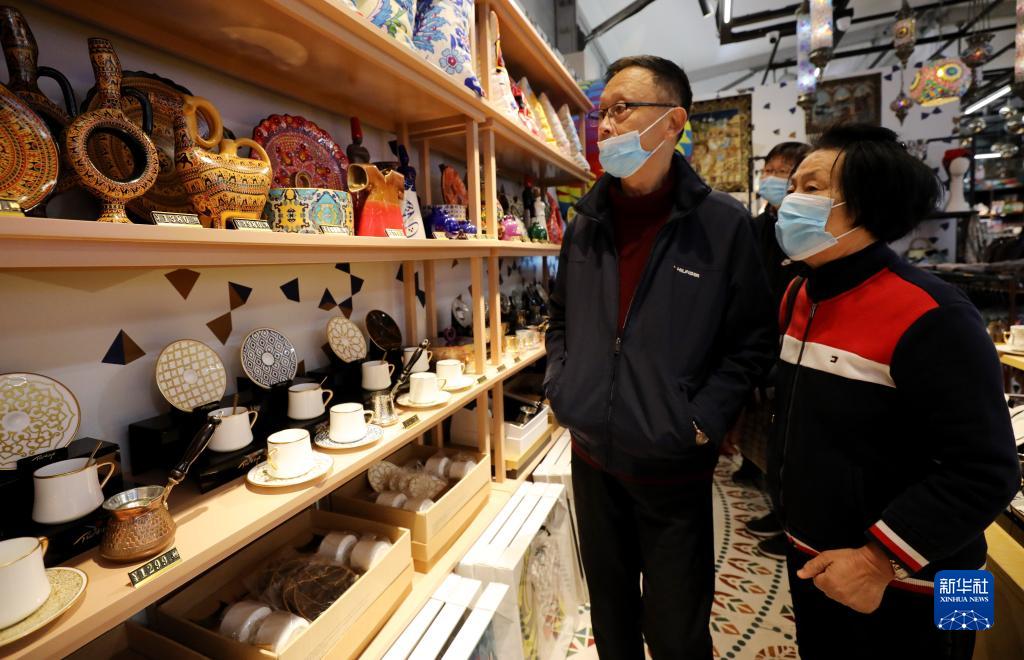 11月8日,顾客在进博集市内的土耳其手工艺品展架前驻足观看。